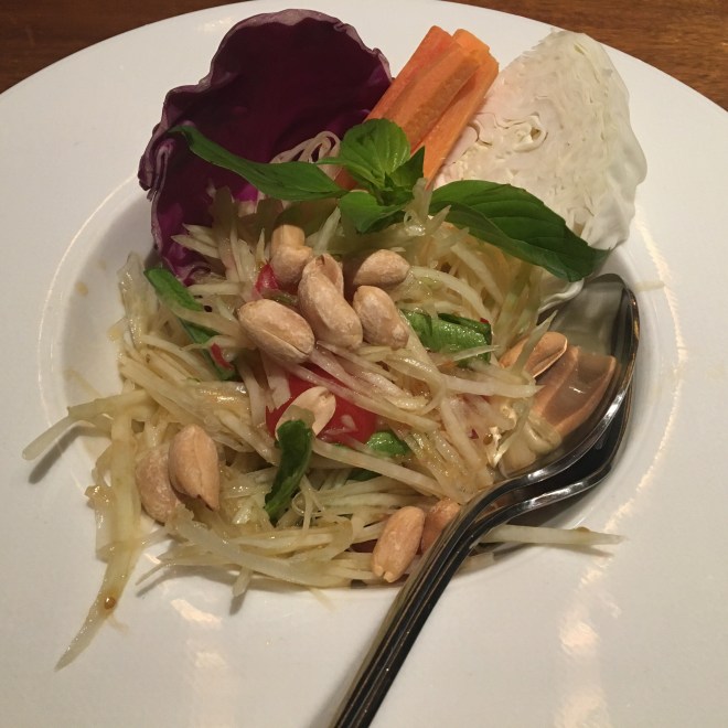 What we Ordered… Raw papaya salad, fried shrimps, tom yum soup, masaman curry, drunk man noodles, chicken satay, stir fried aubergine…